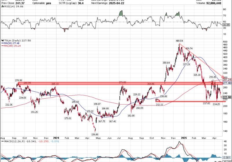 Currently, there’s a descending triangle in a near-term downtrend, with a floor around $215. It has been tested twice and held, but each rally continues to be met with strong resistance. There is more overhead resistance and work to be done to get shares on the right ascending track.